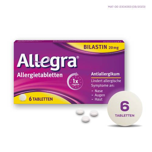 Allegra® Allergietabletten 20 mg Tabletten. Wirkstoff: Bilastin. Anwendungsgebiet: Antihistaminikum. Zur Linderung der Beschwerden allergischer Rhinokonjunktivitis und Urtikaria. Apothekenpflichtig.