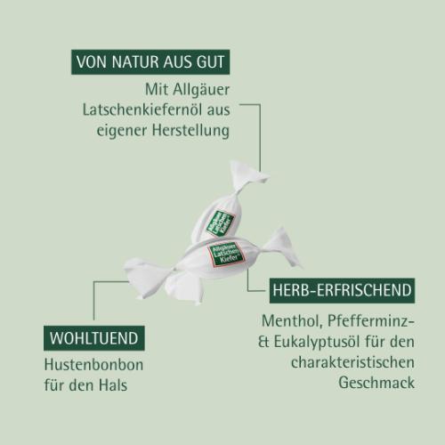 Das enthaltene Latschenkiefernöl stammt von den hoch gelegenen Berghängen der Allgäuer Alpen, wo die widerstandsfähige Latschenkiefer auf bis zu 1.400 Metern Höhe wächst – Jahr für Jahr - Wind, Schnee und Kälte trotzend. Auf hauseigenen Plantagen angebaut und nach rund 13 Jahren sorgfältig geerntet, wird aus der Latschenkiefer in einem schonenden Destillationsverfahren das charakteristische Latschenkiefernöl gewonnen, das den Bonbons ihre unverkennbare Note verleiht. In Kombination mit Honig und weiteren Inhaltsstoffen entsteht so ein wohltuender Begleiter – ideal für unterwegs, bei rauer Luft oder in der kalten Jahreszeit.