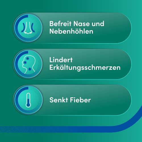- 3-fach effektiv bei Erkältungen mit Schnupfen, Schmerzen und Fieber: wirkt abschwellend in Nase und Nebenhöhlen, bekämpft Erkältungsschmerzen (wie Kopf-, Hals- und Gliederschmerzen) und senkt das Fieber