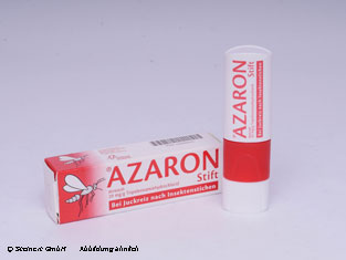Der Azaron Stick wird zur schnellen Hilfe nach Insektenstichen angewendet. Der Stick enthaelt den Wirkstoff Tripelennamin. Bei einem Insektenstich wird von der Muecke Histamin in den Stich abgegeben, wodurch es zu der allergischen Reaktion mit Juckreiz und Schwellung kommt. Der Wirkstoff blockiert die Rezeptoren in der Haut, so dass das Histamin nicht mehr in der Lage ist sich auszubreiten. Durch die schnelle Minderung des Juckreizes kommt es seltener zu Infektionen der Stichstelle. Mit dem Azaron Stick ist es moeglich den Wirkstoff punktgenau aufzutragen, wodurch Juckreiz, Roetungen und Schwellungen schnell zurueckgehen.