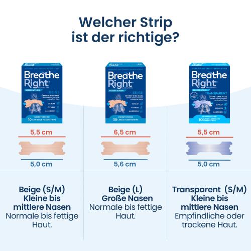 Breathe Right® Nasenstreifen öffnen sofort Ihre Nase, und helfen eine verstopfte Nase zu lindern. Dies spüren Sie sofort. Breathe Right Nasenstreifen lindern Ihre verstopfte Nase, sei es durch Erkältungen, Allergien oder eine Nasenscheidewandverkrümmung, indem sie Ihre Nasenlöcher erweitern und Ihnen helfen, leichter Luft aufzunehmen.