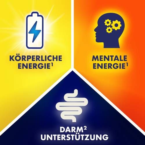 Die einzigartige 3-in-1 Tablette enthält eine Vitaminschicht mit verzögerter Freisetzung, die die Vitamine B1, B2, Niacin, Pantothensäure, Vitamin B6 und Vitamin C über 6 Stunden zur Energiegewinnung freisetzt1, und eine Schicht, die Bakterien der Darmflora liefert, die den Darm lebend erreichen3.