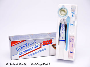 Das Bonyplus Zahnprothesen Reparatur Set wird zur Reparatur von Zahnprothesen aus Kunstharz angewendet. In dem Set sind eine Tube Sofortkleber, ein Fläschchen Flüssigkeit und ein Fläschchen Pulver enthalten. Beim Kleber handelt es sich um einen besonders stark haftenden Kleber, welcher sehr schnell härtet. Das Pulver muss unmittelbar vor der Anwendung mit der Flüssigkeit gemischt werden. Die dabei entstehende Paste wird so lange durchgerührt bis sie glatt und homogen ist. Diese Paste bringt man auf die, vorher mit dem Kleber behandelten, Bruchstelle auf und modelliert sie mit dem Finger. Das Bonyplus Zahnprothese Reparatur Set bietet die Möglichkeit die Prothese auch auf Reisen oder am Wochenende schnell und sicher selbst zu reparieren.