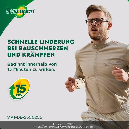 Buscopan® Dragées. Wirkstoff: Butylscopolaminiumbromid. Anwendungsgebiet: Zur Behandlung von leichten bis mäßig starken Krämpfen des Magen-Darm-Traktes, sowie zur Behandlung krampfartiger Bauchschmerzen beim Reizdarmsyndrom. Hinweis: Enthält Sucrose (Zucker). Packungsbeilage beachten. Apothekenpflichtig.