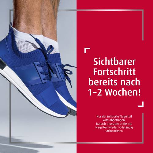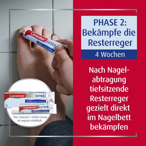 Die Kurztherapie mit Canesten® Extra bekämpft Nagelpilz gründlich und dauert nur 2+4 Wochen. Dies wird ermöglicht durch das spezielle 2-Wirkstoff-System aus Urea Creme und Bifonazol im Canesten Extra Nagelset. Es entfernt in nur 2 Wochen gezielt nur die infizierten Nagelteile. Damit der Nagel gesund nachwachsen kann, schließt sich eine ca. 4-wöchige Behandlung mit der Canesten Extra Creme* an.