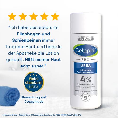 Cetaphil PRO Urea 4% aufbauende Feuchtigkeitslotion ist eine reichhaltige Pflege für trockene und raue Haut. Dank der besonders reichhaltigen Formulierung kann der natürliche Feuchtigkeitskomplex aus Urea & Laktat eine besonders tiefenwirksame & langanhaltende Wirkung entfalten. Der Wassergehalt der Haut wird sofort und langanhaltend erhöht, gleichzeitig stärken wertvolle Lipide die natürliche Hautbarriere und helfen so, die Haut vor dem Austrocknen zu schützen. So wird Ihre Haut hydratisiert, gepflegt und geglättet, die Hautbarriere gestärkt und die Regeneration der Haut unterstützt. Für ein angenehme glattes, weiches und gesundes Hautgefühl, mit dem Sie sich wieder wohl fühlen. Auch in der Begleitpflege von Neurodermitis oder altersbedingter Xerose geeignet und klinisch getestet.