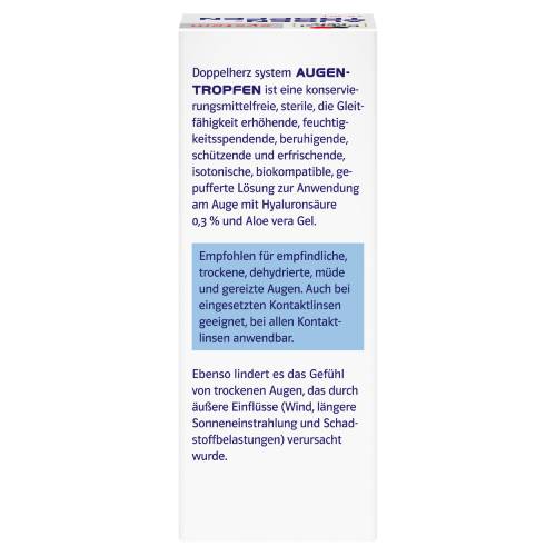 Doppelherz system AUGEN-TROPFEN mit Hyaluronsäure + Aloe Vera befeuchten und erfrischen die gereizten Augen und sorgen so für ein schnelles Abklingen der Symptome wie müde, gereizte und trockene Augen.