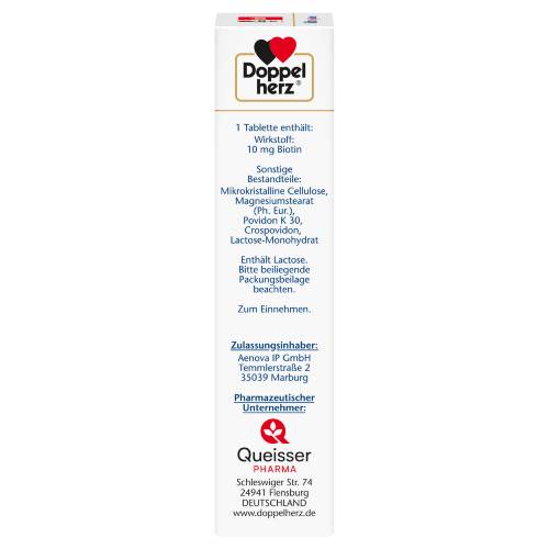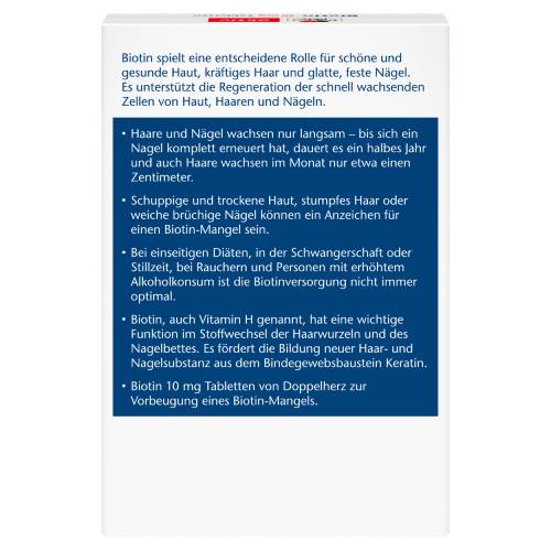 Doppelherz Biotin 10 mg Tabletten zum Einnehmen ist ein Arzneimittel mit dem Wirkstoff Biotin. Biotin, auch Vitamin H genannt, hat eine wichtige Funktion im Stoffwechsel der Haarwurzeln und des Nagelbettes. Es fördert die Bildung neuer Haar- und Nagelsubstanz aus dem Bindegewebsbaustein Keratin. Haare und Nägel wachsen nur langsam - bis sich ein Nagel komplett erneuert hat, dauert es ein halbes Jahr und auch Haare wachsen im Monat nur etwa einen Zentimeter. Schuppige und trockene Haut, stumpfes Haar oder weiche, brüchige Nägel können ein Anzeichen für einen Biotin-Mangel sein. Bei einseitigen Diäten, in der Schwangerschaft oder Stillzeit, bei Rauchern und Personen mit erhöhtem Alkoholkonsum ist die Biotinversorgung nicht immer optimal.