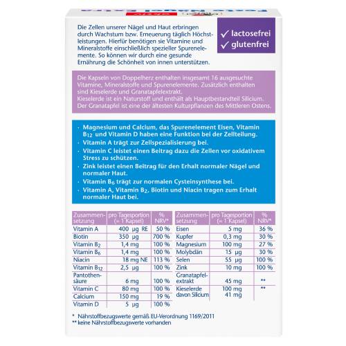 Die Kapseln von Doppelherz enthalten insgesamt 16 ausgesuchte Vitamine, Mineralstoffe und Spurenelemente. Zusätzlich enthalten sind 100 mg Kieselerde und 45 mg Granatapfelextrakt.