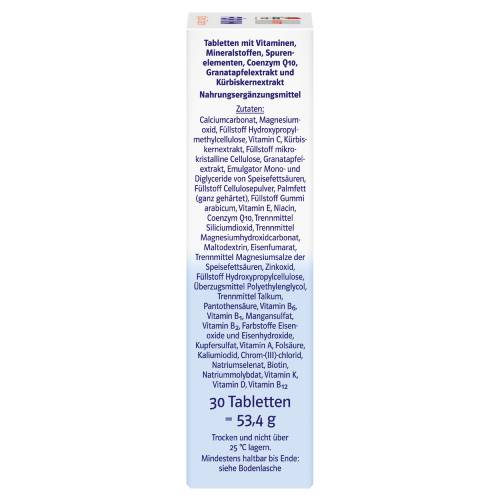 Zusätzlich enthalten sind 20 mg Coenzym Q10, 50 mg Granatapfelextrakt und 135 mg Kürbiskernextrakt.