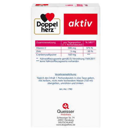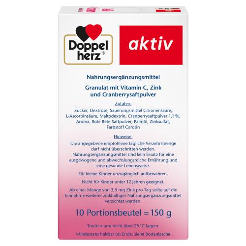 Ein Portionsbeutel Doppelherz Heiße Cranberry liefert 160 mg Cranberrysaftpulver sowie 300 mg Vitamin C und 5 mg Zink.