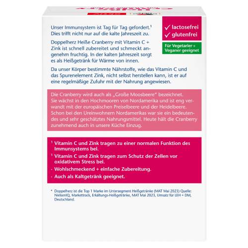 Doppelherz Heiße Cranberry mit Vitamin C + Zink ist dank der einzelnen Portionsbeutel schnell und einfach zubereitet und schmeckt angenehm fruchtig. In der kalten Jahreszeit sorgt es als Heißgetränk für Wärme von innen. Aber es kann in den wärmeren Sommermonaten auch als erfrischendes Kaltgetränk getrunken werden.
