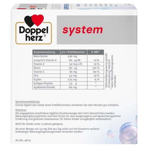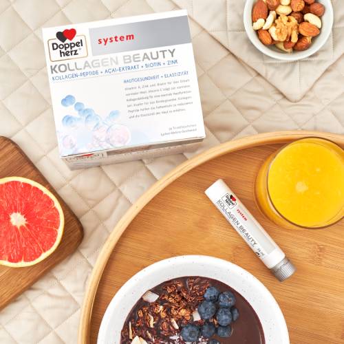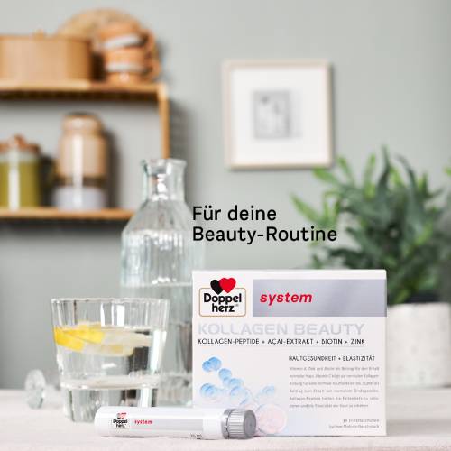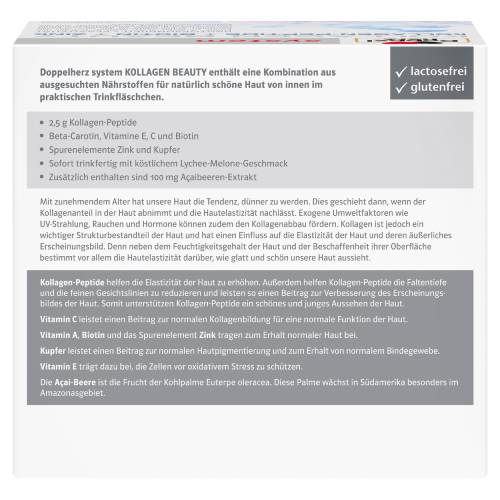 Doppelherz system KOLLAGEN BEAUTY enthält eine Kombination aus ausgesuchten Nährstoffen für natürlich schöne Haut von innen im praktischen Trinkfläschchen. Ein Trinkfläschchen enthält 2,5 g Kollagen-Peptide, Beta-Carotin, Vitamine E, C, Biotin sowie die Spurenelemente Zink und Kupfer. Zusätzlich sind in einem Trinkfläschchen 100 mg Açaibeeren-Extrakt enthalten. Die aufeinander abgestimmten Nährstoffe sind sofort trinkfertig mit köstlichem Lychee-Melone-Geschmack. Mit zunehmendem Alter hat unsere Haut die Tendenz, dünner zu werden. Dies geschieht dann, wenn der Kollagenanteil in der Haut abnimmt und die Hautelastizität nachlässt. Exogene Umweltfaktoren wie UV-Strahlung, Rauchen und Hormone können zudem den Kollagenabbau fördern. Kollagen ist jedoch ein wichtiger Strukturbestandteil der Haut und hat einen Einfluss auf die Elastizität der Haut und deren äußerliches Erscheinungsbild. Denn neben dem Feuchtigkeitsgehalt der Haut und der Beschaffenheit ihrer Oberfläche bestimmt vor allem die Hautelastizität darüber, wie glatt und schön unsere Haut aussieht. Kollagen-Peptide helfen die Elastizität der Haut zu erhöhen. Außerdem helfen Kollagen-Peptide, die Faltentiefe und die feinen Gesichtslinien zu reduzieren und