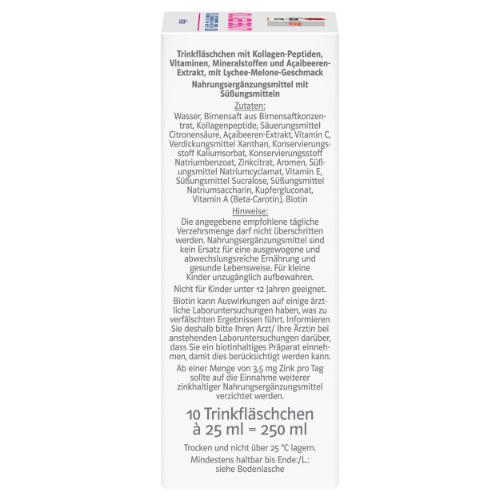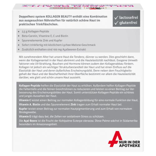 Jedes Trinkfläschchen Doppelherz system KOLLAGEN BEAUTY enthält 2,5 g Kollagen-Peptide sowie ausgesuchte Vitamine und Spurenelemente plus Açaibeeren-Extrakt. Als hochwertiges Nahrungsergänzungsmittel ist Doppelherz system KOLLAGEN BEAUTY für die langfristige Einnahme konzipiert. Die aufeinander abgestimmten Nährstoffe sind im praktischen Trinkfläschchen enthalten – sofort trinkfertig mit köstlichem Lychee-Melone-Geschmack! Mit zunehmendem Alter hat unsere Haut die Tendenz, dünner zu werden. Dies geschieht dann, wenn der Kollagenanteil in der Haut abnimmt und die Hautelastizität nachlässt. Bereits ab 25 Jahren reduziert sich die körpereigene Kollagenproduktion. Hinzu kommt, dass äußere Faktoren wie die UV-Strahlung der Sonne sowie schlechte Lebensgewohnheiten wie Rauchen den Kollagenabbau beschleunigen können. Kollagen-Peptide helfen, die Faltentiefe zu reduzieren und die Elastizität der Haut zu erhöhen, was in zwei placebokontrollierten Studien mit Kollagen-Peptiden an Frauen getestet wurde.