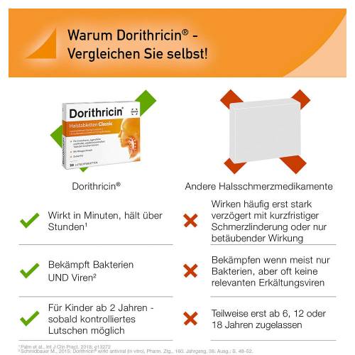 Der Vorteil: Dorithricin® bekämpft Halsschmerzen und Schluckbeschwerden schnell und langanhaltend, ohne dass dabei ein unangenehmes Taubheitsgefühl im Mund entsteht.