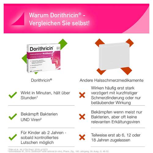 Der Vorteil: Dorithricin® bekämpft Halsschmerzen und Schluckbeschwerden schnell und langanhaltend, ohne dass dabei ein unangenehmes Taubheitsgefühl im Mund entsteht.