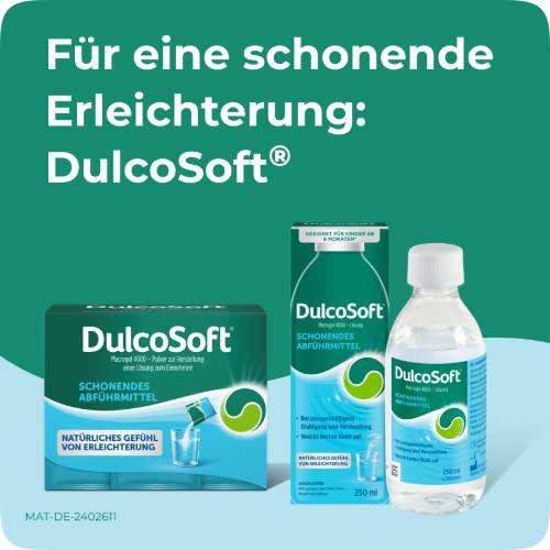 Wer regelmäßig unter trockenem, hartem Stuhl oder unter Verstopfung leidet, weiß, wie unangenehm dies im Alltag sein kann. Denn ein schmerzhafter, erschwerter Stuhlgang ist äußerst lästig und die Beschwerden können sich auch auf das Wohlbefinden auswirken. Hier kann DulcoSoft® Pulver helfen, die natürliche Darmtätigkeit zu unterstützen. Der Inhaltsstoff Macrogol 4000 setzt dort an, wo es nötig ist: Er bindet Flüssigkeit im Darm. Dies macht den harten Stuhl weicher, fördert schonend die Darmtätigkeit und erleichtert so den Stuhlgang ohne plötzlichen Drang.