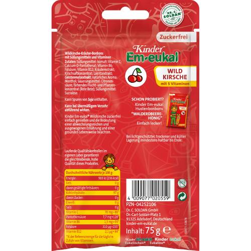 Kinder Em Eukal Vitamin Hustenbonbons mit Wildkirschgeschmack, Malz, Honig und Kräuterextrakten haben den fruchtigen Geschmack der Wildkirsche, den Kinder und Muttis echt stark finden. Vitamin C steigert die Abwehrkräfte.