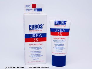 Die Eubos trockene Haut Urea 5 % Nachtcreme wird zur medizinischen Spezialpflege bei extrem trockener, juckender und schuppender Haut angewendet. Die Creme enthält eine Kombination aus Süßmandelöl, Glycerin, Allantoin und Natriumlactat in einer Öl in Wasser Emulsion. Die Creme eignet sich auch zur therapiebegleitenden Pflege bei Neurodermitis und Psoriasis. Die Kombination der Wirkstoffe erhöht den Feuchtigkeitsgehalt der Haut. Die Eubos trockene Haut Urea 5% Nachtcreme kann die Abschuppung der Haut unterstützen, den Juckreiz lindern und dafür sorgen, dass die Haut sich spürbar glatter und weicher anfühlt.
