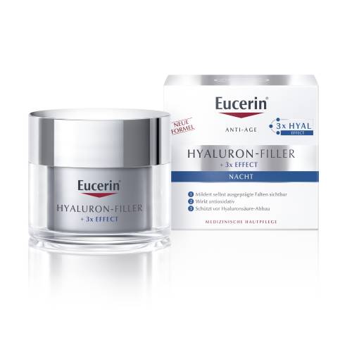 Die Eucerin Anti Age Hyaluron Filler Nachtcreme wird zur intensiven Nachtpflege von reifer Haut angewendet. Die Creme enthält eine Kombination der beiden Wirkstoffe hochkonzentriertes Saponin und Hyaluronsäure. Saponin unterstützt die Produktion der hauteigenen Hyaluronsäure, wodurch das Bindegewebe ganz natürlich aufgepolstert wird und selbst tiefe Falten gemildert wirken. Die Hyaluronsäure versorgt die oberste Hautschicht, so dass kleinere Trockenheitsfältchen geglättet werden. Die Eucerin Anti Age Hyaluron Filler Nachtcreme polstert die Haut von innen heraus auf und regeneriert die Haut über Nacht.