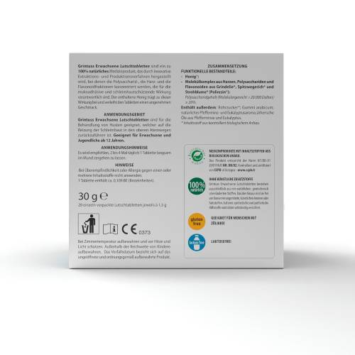 Grintuss Erwachsene Lutschtabletten sind ein zu 100% natürliches Produkt auf Basis von Honig und dem pflanzlichen Molekülkomplex Poliresin®. Dank seiner physiologischen Wirkung schützt es die oberen Atemwege und lindert deren Reizung. Grintuss ist ohne Alkohol und glutenfrei mit einem angenehmen Geschmack. Seine Inhaltstoffe stammen dabei aus nachhaltigem und biologischem Anbau. Grintuss schützt die Schleimhaut, indem es die Reizung beruhigt und die Schleimhaut befeuchtet.