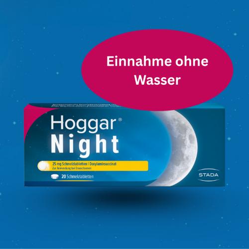 Hoggar® Night 25 mg Schmelztabletten Zur Anwendung bei Erwachsenen. Wirkstoff: Doxylaminsuccinat. Zur symptomatischen Kurzzeitbehandlung von gelegentlichen Schlafstörungen bei Erwachsenen. Hinweis: Nicht alle Schlafstörungen bedürfen einer medikamentösen Therapie. Oftmals sind sie Ausdruck körperlicher oder seelischer Erkrankungen und können durch andere Maßnahmen oder eine Therapie der Grundkrankheit beeinflusst werden. Deshalb sollte Hoggar® Night nicht zur Dauerbehandlung von länger anhaltenden Schlafstörungen angewendet werden. Suchen Sie stattdessen Ihren behandelnden Arzt auf. Enthält Glucose und Natrium. Zu Risiken und Nebenwirkungen lesen Sie die Packungsbeilage und fragen Sie Ihre Ärztin, Ihren Arzt oder in Ihrer Apotheke.