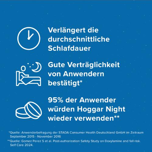 Hoggar® Night 25 mg Doxylaminsuccinat Tabletten Wirkstoff: Doxylaminsuccinat. Zur Kurzzeitbehandlung von Schlafstörungen. Hinweis: Nicht alle Schlafstörungen bedürfen einer medikamentösen Therapie. Oftmals sind sie Ausdruck körperlicher oder seelischer Erkrankungen und können durch andere Maßnahmen oder eine Therapie der Grundkrankheit beeinflusst werden. Deshalb sollte bei länger anhaltenden Schlafstörungen keine Dauerbehandlung mit Hoggar® Night erfolgen, sondern der behandelnde Arzt aufgesucht werden. Nicht ohne Befragen des Arztes über längere Zeit oder in höheren Dosierungen als angegeben einnehmen. Enthält Lactose.