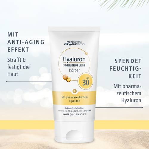 Die Hyaluron Sonnenpflege Körper LSF 30 von medipharma cosmetics bietet empfindlicher und trockener Haut zuverlässigen Schutz und intensive Feuchtigkeitspflege bei starker Sonneneinstrahlung.
