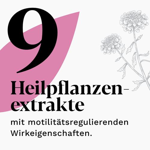 - einzigartige Kombination aus 9 Heilpflanzenextrakten mit einem höheren Anteil an Extrakten mit motilitätsregulierenden Wirkeigenschaften