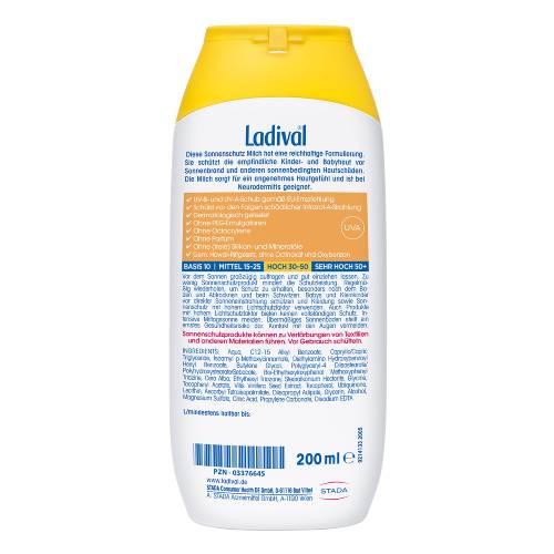 Die Ladival Kinder Sonnenmilch LSF 30 wird zum Schutz von empfindlicher Kinderhaut vor einer intensiven Sonneneinstrahlung angewendet. Die Sonnenmilch enthält eine Kombination aus organischen und mineralischen Filtern, Vitamin E und pflegende Öle. Durch den besonderen Infrarot-Schutz-Komplex werden Langzeitschäden durch Infrarot-A-Strahlen vermieden. Das Mittel bietet eine hohe Wasserfestigkeit und einen höchstmöglichen Schutz für die zarte Kinderhaut. Die Sonnenmilch schützt sofort nach dem Auftragen. Die Ladival Kinder Sonnenmilch LSF 30 ist extra auf die Bedürfnisse von kleineren Kindern zugeschnitten.