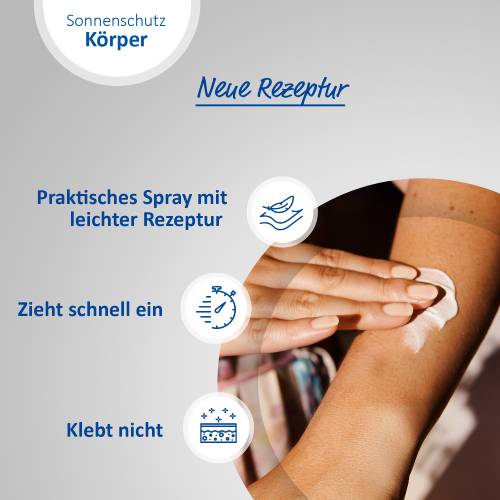Tragen Sie das Sonnenschutz-Spray vor dem Sonnen großzügig auf und cremen Ihren ganzen Körper damit ein. Besonders gut eincremen: Nasen, Lippen, Ohren, Schultern, Dekolleté, Fußrücken und unbehaarte Kopfhaut. Um den Schutz aufrechtzuerhalten, alle zwei Stunden sowie nach dem Baden und Schwitzen nachcremen. Zu wenig Sonnenschutzmittel verringert den Lichtschutzfaktor.