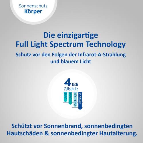 Sonnenstrahlen gibt es in verschiedenen Wellenlängen. Sie haben verschiedene Auswirkungen auf die Haut, wirken jedoch alle zellschädigend. Daher ist es wichtig einen Sonnenschutz zu verwenden, der rundum schützt. Dank einzigartigem 4-fach Zellschutz schützt das Ladival® Trockene Haut Sonnenschutz-Spray vor UV-A- und UV-B-Strahlen, vor den Folgen der Infrarot-A-Strahlung und sichtbarem Licht (einschließlich blauem Licht). So wird die Haut auch vor einer vorzeitigen, sonnenbedingten Hautalterung geschützt.