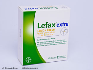 Das Lefax extra Lemon Fresh Granulat wird zur schnellen Behandlung von stärkeren Beschwerden, welche durch zu viel Luft im Magen Darm Trakt hervorgerufen werden, angewendet. Das Granulat enthält den Wirkstoff Simeticon. Durch den Wirkstoff wird die Oberflächenspannung der Gasbläschen verändert. Das Simetion ist in der Lage die Bläschen zum Zerfallen zu bringen. Diese Gasbläschen entstehen ganz natürlich bei der Verdauung und können einen schmerzhaften Druck hervorrufen. Das Lefax extra Lemon Fresh Granulat wirkt ausschließlich im Darm und lindert so die typischen Beschwerden, wie Blähungen, Völlegefühl und Magendruck.