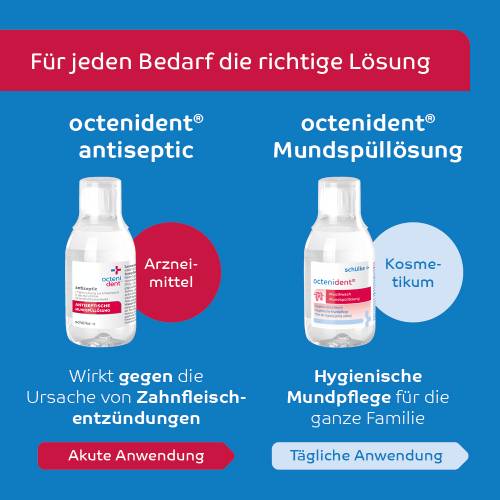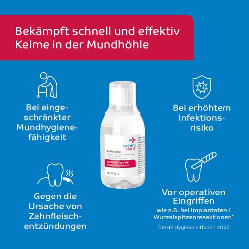 Wirkstoff: Octenidindihydrochlorid. Anwendungsgebiete: octenident® antiseptic hat eine antimikrobielle Wirksamkeit. Es wird angewendet zur vorübergehenden Keimzahlreduktion in der Mundhöhle, zur vorübergehenden Hemmung der Plaque-Bildung und bei eingeschränkter Mundhygienefähigkeit (z.B. wenn kein Zähneputzen möglich ist) bei Erwachsenen.