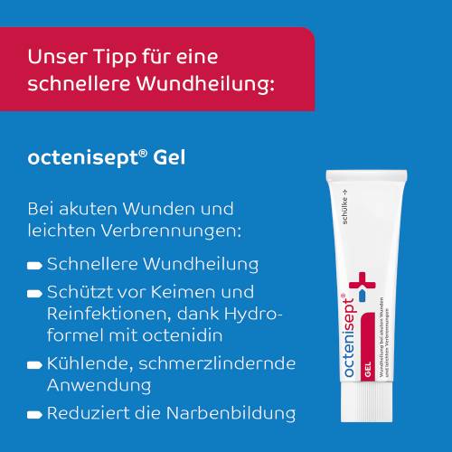 Mit der Anwendung des octenisept® Wund-Desinfektion Spray ist die Wunde optimal für das heilungsfördernde octenisept® Gel vorbereitet. Das Hydrogel schützt die Wunde und sorgt für eine schnellere Wundheilung – die perfekte zweifache Hilfe für Ihre Wundversorgung.