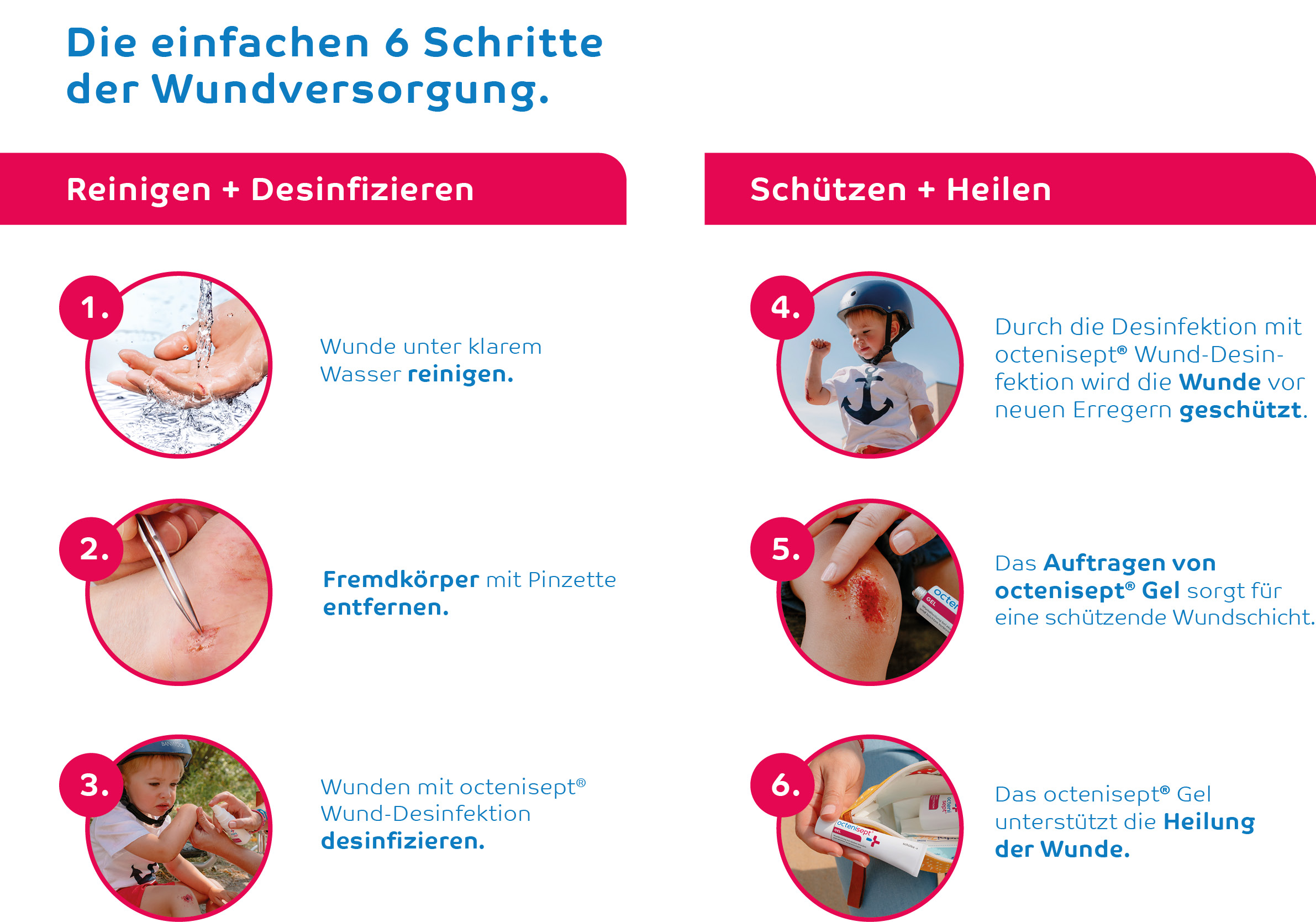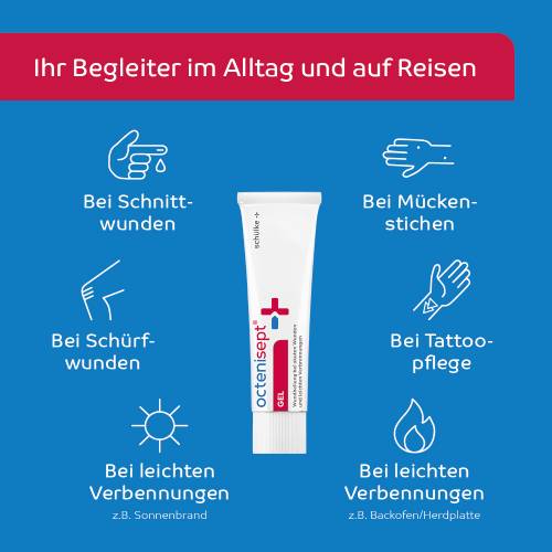 octenisept® Gel unterstützt den Heilungsprozess von akuten Hautwunden, die rasch beim Sport, im Alltag oder in der Freizeit entstehen können. Nach der Reinigung und Desinfektion von leichten Schnitt- und Schürfwunden schafft octenisept® Gel ein feuchtes Milieu und hält die Wunde durch eine schützende Schicht keimfrei. Das Gel kühlt betroffene Stellen und brennt nicht. Angewendet werden kann es sowohl bei Erwachsenen als auch bei Kindern.