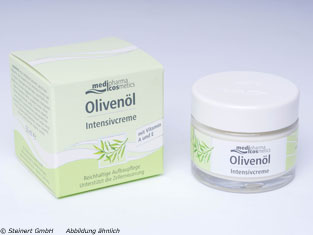 Die Olivenöl Intensivcreme wird zur Pflege von trockener und empfindlicher Gesichtshaut angewendet. Die Creme Olivenöl, Retinol,  Panthenol und Vitamin E. Dadurch, dass es sich bei der Creme um eine Wasser in Öl Emulsion handelt verbleiben die pflegenden Öle länger auf der Haut, wodurch die trockene Haut intensiver regeneriert werden können. Das Retinol beschleunigt den Zellerneuerungsprozess der Haut. Die Olivenöl Intensivcreme sorgt dafür, dass die Haut sich weich und geschmeidig anfühlt und schützt sie nachhaltig vor Feuchtigkeitsverlusten.
