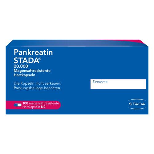 Wirkstoff: Pankreas-Pulver vom Schwein (Pankreatin) entsprechend 20.000 Ph.Eur.-Einheiten Lipase/Kapsel. Wird Zur Behandlung einer exokrinen Pankreasinsuffizienz angewendet. Hierbei produziert die Bauchspeicheldrüse nicht genügend Enzyme, um die Nahrung zu verdauen. Pankreatin STADA® kann bei Kindern, Jugendlichen und Erwachsenen angewendet werden. Die Behandlung mit Pankreatin STADA® verbessert die Symptome der exokrinen Pankreasinsuffizienz, einschließlich Stuhlkonsistenz (z.B. fettiger Stuhl), Bauchschmerzen, Flatulenz und Stuhlfrequenz (Durchfall oder Verstopfung). Wenn Sie sich nach 5 Tagen nicht besser oder gar schlechter fühlen, wenden Sie sich an Ihren Arzt.