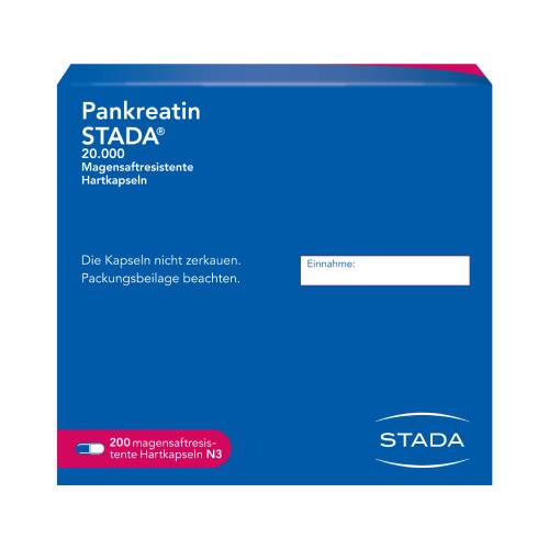 Wirkstoff: Pankreas-Pulver vom Schwein (Pankreatin) entsprechend 20.000 Ph.Eur.-Einheiten Lipase/Kapsel. Wird Zur Behandlung einer exokrinen Pankreasinsuffizienz angewendet. Hierbei produziert die Bauchspeicheldrüse nicht genügend Enzyme, um die Nahrung zu verdauen. Pankreatin STADA® kann bei Kindern, Jugendlichen und Erwachsenen angewendet werden. Die Behandlung mit Pankreatin STADA® verbessert die Symptome der exokrinen Pankreasinsuffizienz, einschließlich Stuhlkonsistenz (z.B. fettiger Stuhl), Bauchschmerzen, Flatulenz und Stuhlfrequenz (Durchfall oder Verstopfung). Wenn Sie sich nach 5 Tagen nicht besser oder gar schlechter fühlen, wenden Sie sich an Ihren Arzt.