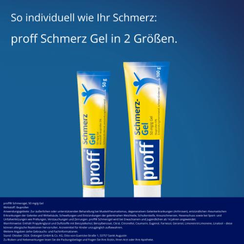 proff® Schmerzgel – Schmerzlinderung mit Ibuprofen Schmerzen in Muskeln und Gelenken können den Alltag stark beeinträchtigen. proff® Schmerzgel wird äußerlich angewendet und gibt den Wirkstoff Ibuprofen über die Haut an die betroffene Stelle ab. Das Gel ist seit 1984 in Deutschland zugelassen und wird seit vielen Jahren in der Schmerzbehandlung eingesetzt. Es ist rezeptfrei, aber apothekenpflichtig erhältlich.