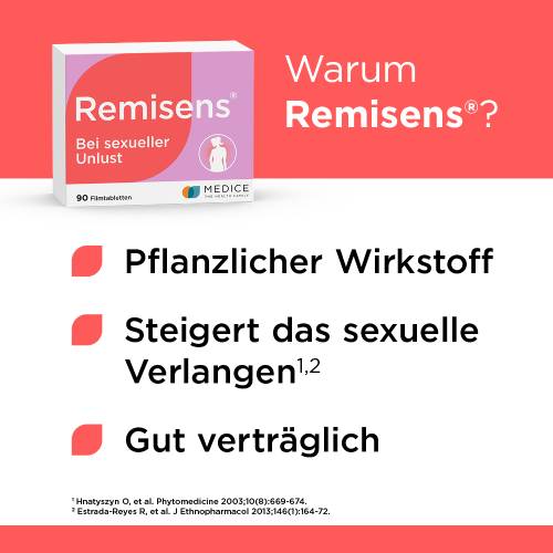 Natürliche und gut verträgliche Unterstützung bei nachlassendem sexuellem Verlangen bietet Remisens, das erste registrierte pflanzliche Aphrodisiakum . Seit dem 1.Juli 2016 ist es in Apotheken erhältlich .