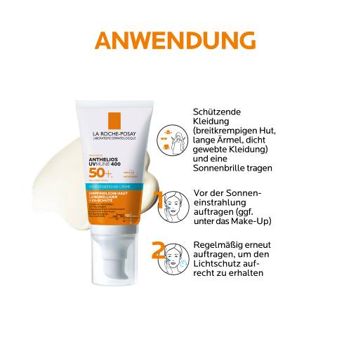 Die Anthelios Hydratisierende Creme UVMune 400 LSF 50+ von La Roche Posay unmittelbar vor dem Aufenthalt in der Sonne auftragen. Der Sonnenschutz ist nur zur äußeren Anwendung gedacht. Regelmäßig und großzügig erneut auftragen, vor allem nach dem Schwitzen oder Abtrocknen. Darüber hinaus übermäßige Sonneneinstrahlung sowie die Mittagshitze meiden und neben dem Sonnenschutz zusätzliche Schutzmaßnahmen ergreifen. Babys und Kleinkinder sollten vor direkter Sonneneinstrahlung geschützt werden.