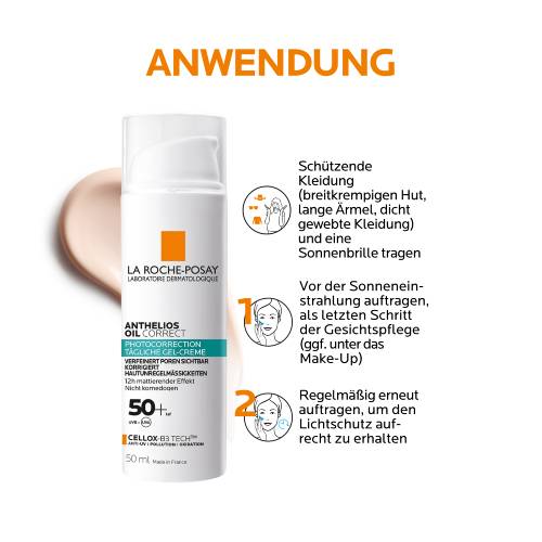 Mattierende Tagescreme mit Lichtschutz Die tägliche anwendbare Feuchtigkeitspflege für fettige Haut Anthelios Oil Correct LSF50+ von La Roche Posay mildert Unreinheiten und mattiert die Haut bis zu zwölf Stunden. Anthelios Oil Correct LSF50+ für fettige und unreine Haut Die Tagespflege von La Roche Posay bietet höchsten UVA-/UVB-Schutz für fettige und unreine Haut. Die Formel der mattierenden Sonnencreme für das Gesicht enthält Salicylsäure, Niacinamid sowie Zink, welche für sichtbar verfeinerte Poren sorgt und Hautunregelmäßigkeiten mildert. Anthelios Oil Correct LSF50+ zeichnet sich durch Cellox-B3 Tech™ aus und wirkt gegen die Auswirkungen von UV-Strahlung, Pollution und Oxidation.