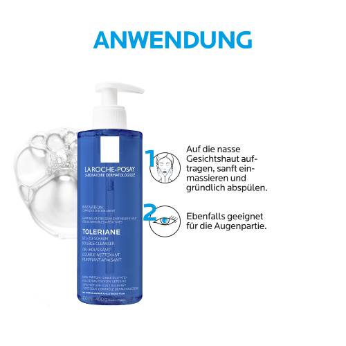 Anwendungshinweis: Für die tägliche Gesichtsreinigung den TOLERIANE Gel-zu-Schaum Double Cleanser morgens und abends auf die nasse Haut im Gesicht und rund um die Augenpartie auftragen. Den Gesichtsreiniger sanft einmassieren und anschließend gründlich abspülen. Nachfolgend empfiehlt sich die Anwendung einer Gesichtspflege – wie z. B. die TOLERIANE Dermallergo Gesichtscreme.