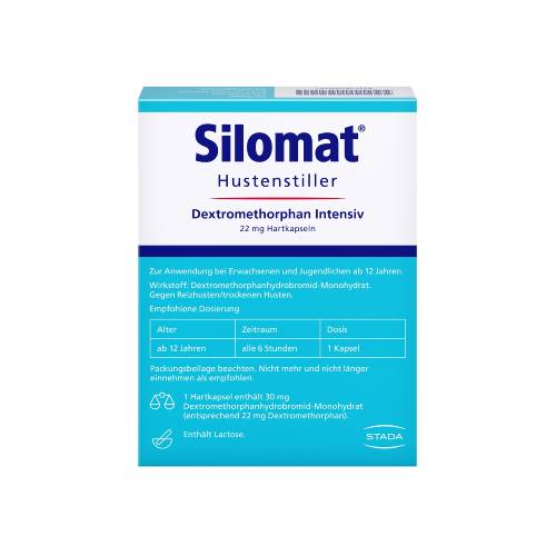 Dextromethorphan, der am besten untersuchte hustenstillende Wirkstoff der Welt, dämpft die Wahrnehmung des Hustenreizes, sodass sich die Schleimhäute in den Bronchien erholen und auch Sie wieder zur Ruhe kommen können. Die leicht zu schluckenden, geschmacksnutralen Silomat® Dextromethorphan Intensiv Hartkapseln sind mit 30mg hochdosiert und wirken bereits nach 15-30 Minuten bis zu 6 Stunden.