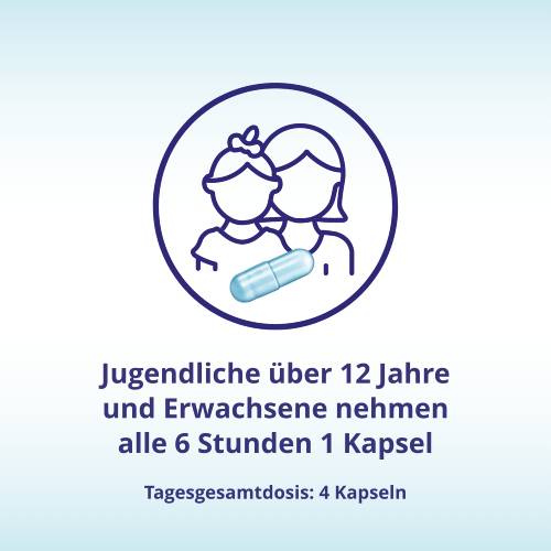 Jugendliche ab 12 Jahren und Erwachsene 1 Kapsel 1-4 mal täglich im Abstand von 6 Stunden, unabhängig von der Mahlzeit