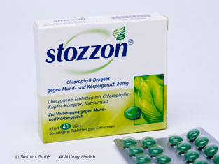 Stozzon Chlorophyll- Dragees gegen Mund- und Körpergeruch. Für Erwachsene und Jugendliche ab 12 Jahren. Wirkstoff: Chlorophyllin-Kupfer-Komplex, Natriumsalz. Anwendungsgebiete: Traditionell angewendet zur Vorbeugung gegen Mund- und Körpergeruch. Beim Auftreten von Krankheitszeichen sollte ein Arzt aufgesucht werden. Warnhinweise: Enthält Saccharose und Lactose.