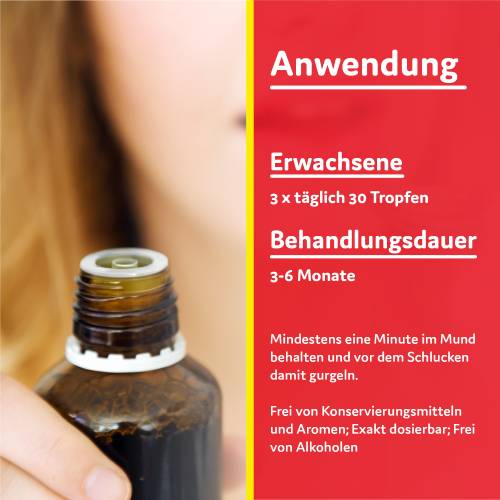 Nehmen Sie das Arzneimittel ein. Behalten Sie die Tropfen circa eine Minute lang im Mund und gurgeln damit vor dem Herunterschlucken.