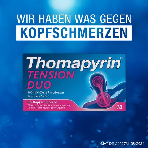 All dies macht Thomapyrin® TENSION DUO mit Ibuprofen und Coffein zu einer guten Wahl bei akuten Kopfschmerzen. 9 von 10 Verwendern sind mit der Wirkung so zufrieden, dass sie Thomapyrin® TENSION DUO erneut kaufen oder weiterempfehlen würden[1]. Überzeugen Sie sich selbst von der innovativen Wirkstoffkombination aus Ibuprofen und Coffein und bekämpfen Sie Kopfschmerzen in Verbindung mit Nacken- und Schulterbeschwerden dank Thomapyrin® TENSION DUO schneller1 und stärker.