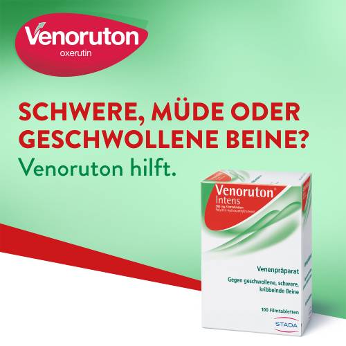 Venoruton hat die Lösung. Bei chronischen Venenleiden bietet Venoruton Intens gezielte medizinische Hilfe. Durch den veredelten Naturwirkstoff Oxerutin wird die erhöhte Durchlässigkeit der geschwächten Venenwände reguliert, wodurch weniger Wasser in das umliegende Gewebe austreten kann (Ödeme). Zusätzlich wir die Durchblutung gefödert und dadurch auch die Versorgung des umliegenden Gewebes verbessert. Die Beschwerden werden spürbar gelindert und einer Verschlimmerung wird von innen vorgebeugt.